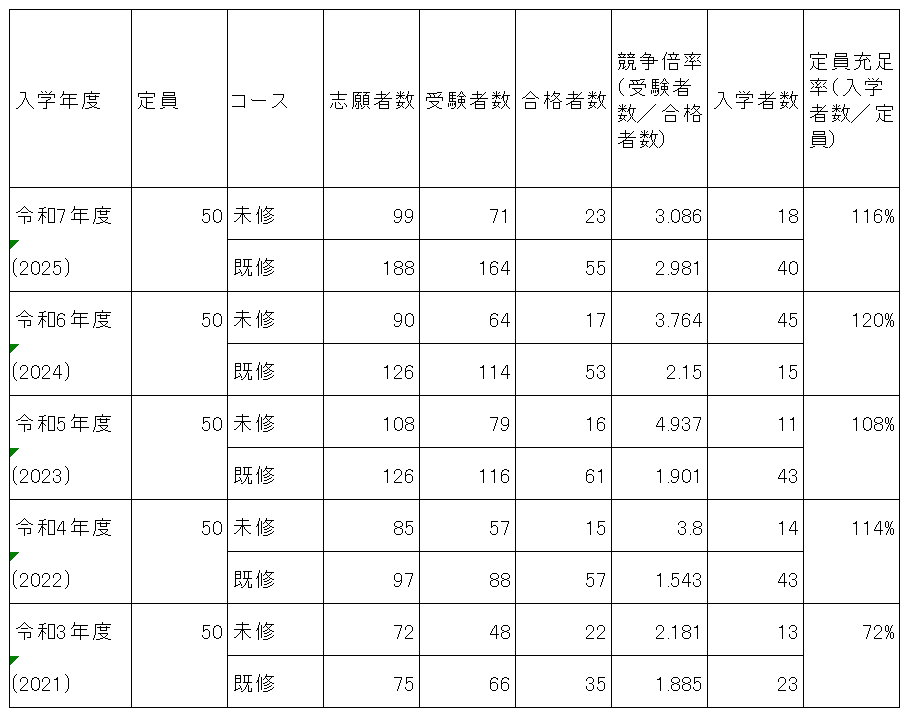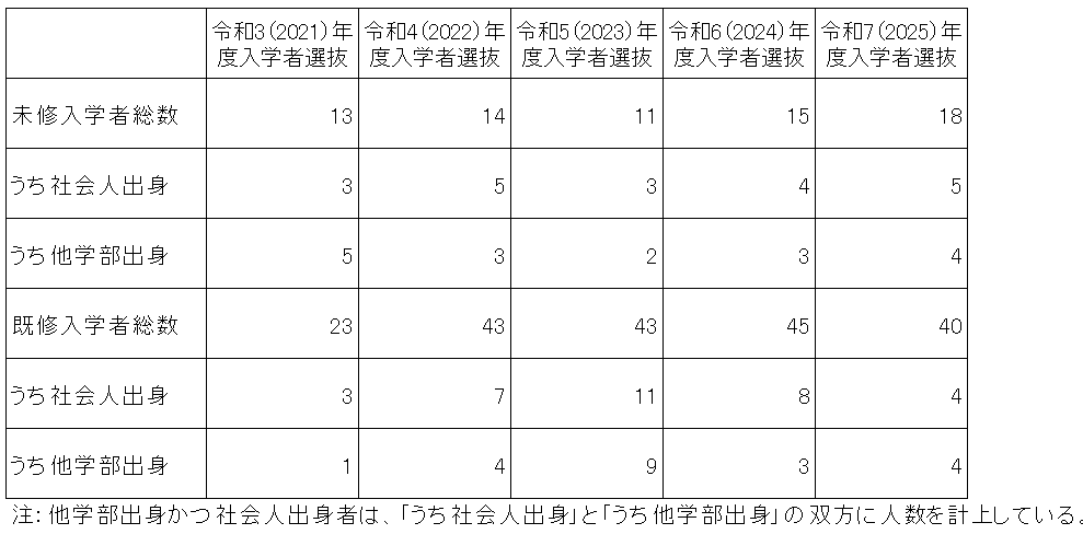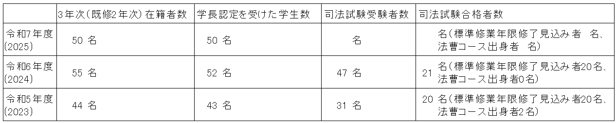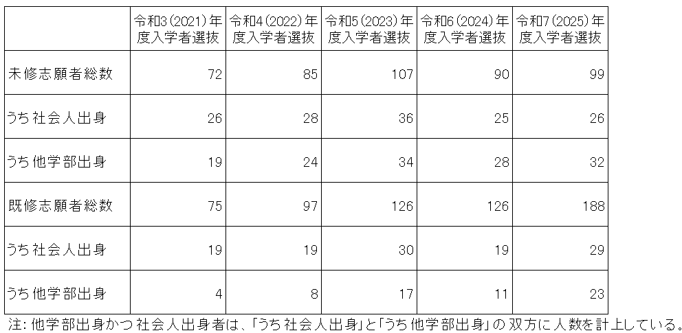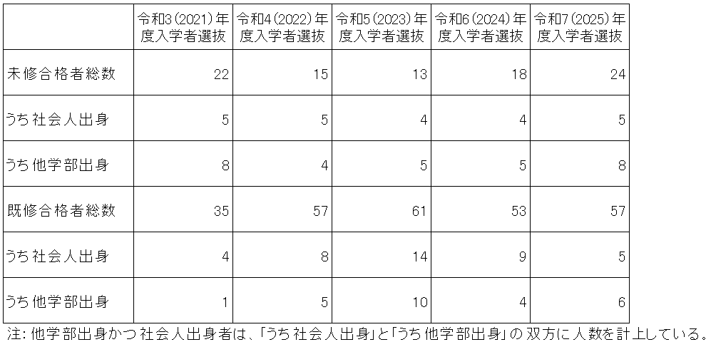 注:定員は全体で50名(収容定員150名)、未修者コース・既修者コースのそれぞれの入学者数目安は20名・30名です。志願者・受験者・合格者総数は、一般入試(第二次募集含む)及び特別入試の志願者・受験者・合格者総数を合計したものです(併願者のうち既修者コース合格者は未修者コースの受験者から除いています)。入学者選抜のより詳細な状況については、「入学試験の結果」をご覧下さい。