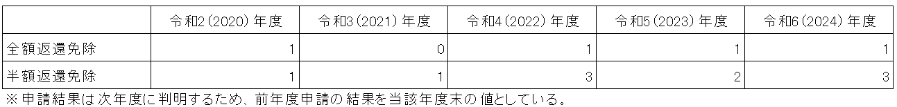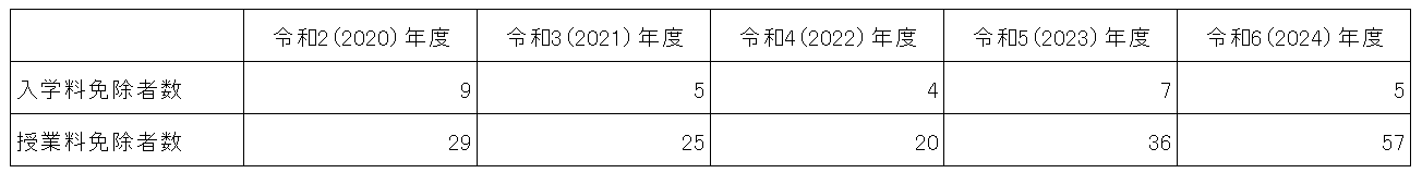 成績優秀で経済的な困難がある者に対して、予算の範囲内での入学料・授業料免除制度があります(詳しくはこちらの入学料免除(及び徴収猶予)・授業料免除)。免除実績は、以下の通りです。
